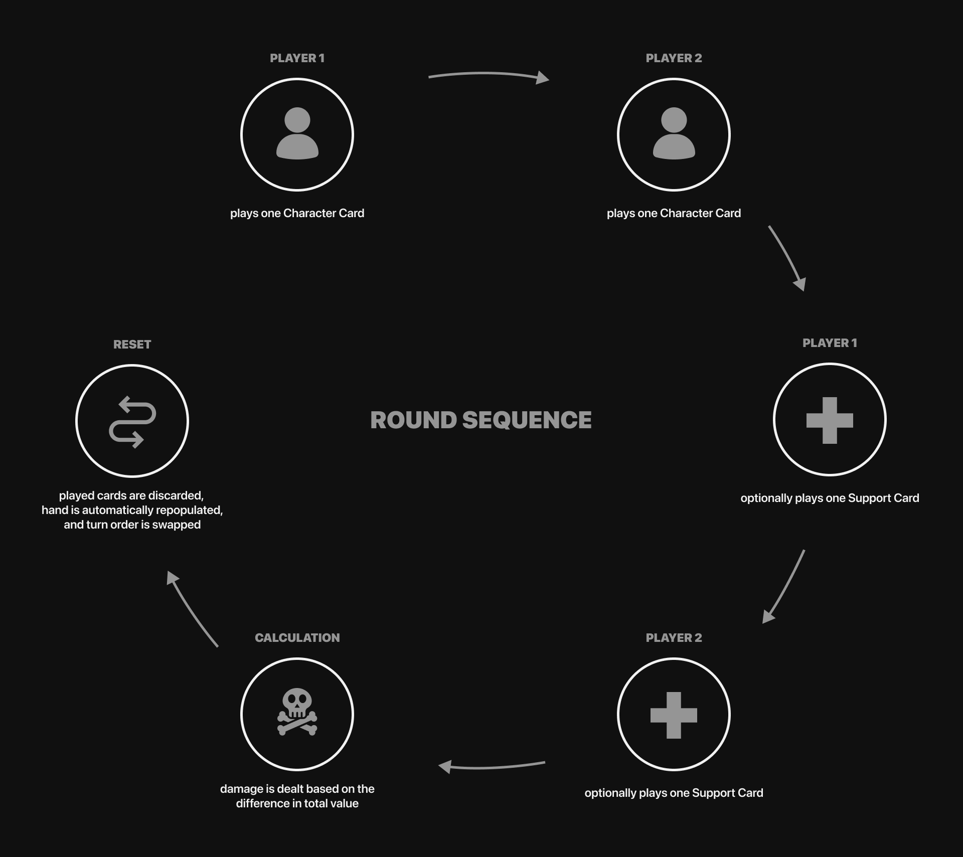 Values are compared. Damage is calculated and the difference is dealt directly to the loser’s health.